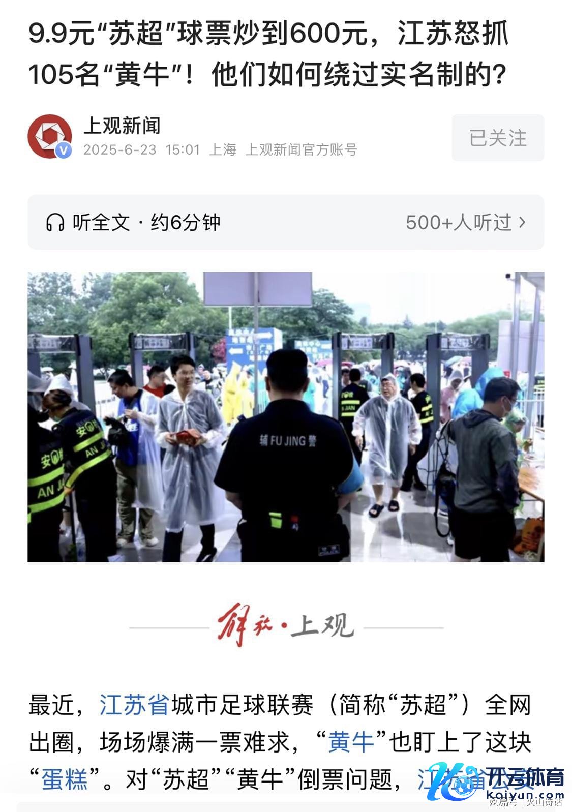 而仔6月23日,有媒体曝光,9.9元“苏超”球票炒到600元,江苏怒握105名“黄牛”!