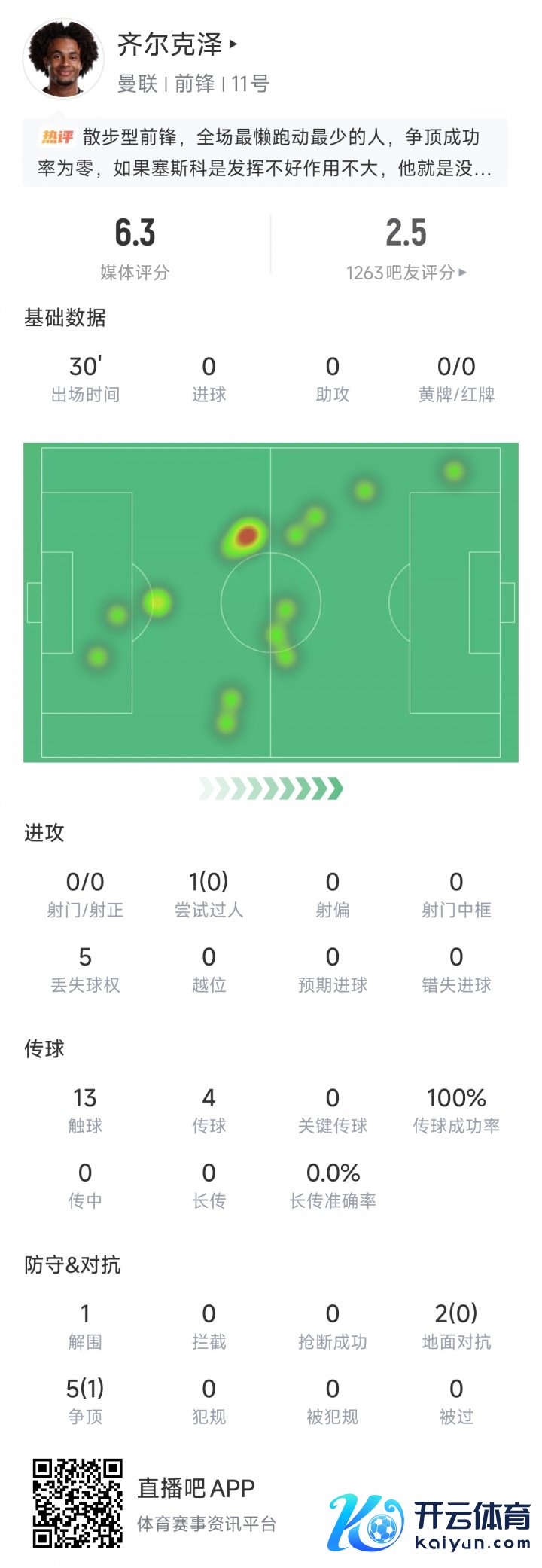 此役都尔克泽在30分钟里触球13次,5次丢球权,莫得射门,过东说念主1次失败。挣扎方面他总共7次挣扎只得胜1次。大部分数据挂零的情况下,他传球4次100%得胜率和1次突围算为数未几的亮点。