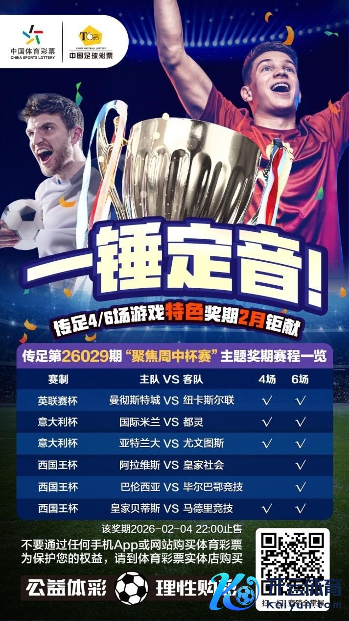 第26029期传足4/6场游戏特质奖期依然于2026年2月1日20:00开售澳门买球网体育信息,将于2026年2月4日22:00停售,并于2026年2月6日开奖,其中曼彻斯特城VS纽卡斯尔联、海外米兰VS皆灵、亚特兰大VS尤文图斯和皇家贝蒂斯VS马德里竞技为4场进球游戏竞猜赛事。