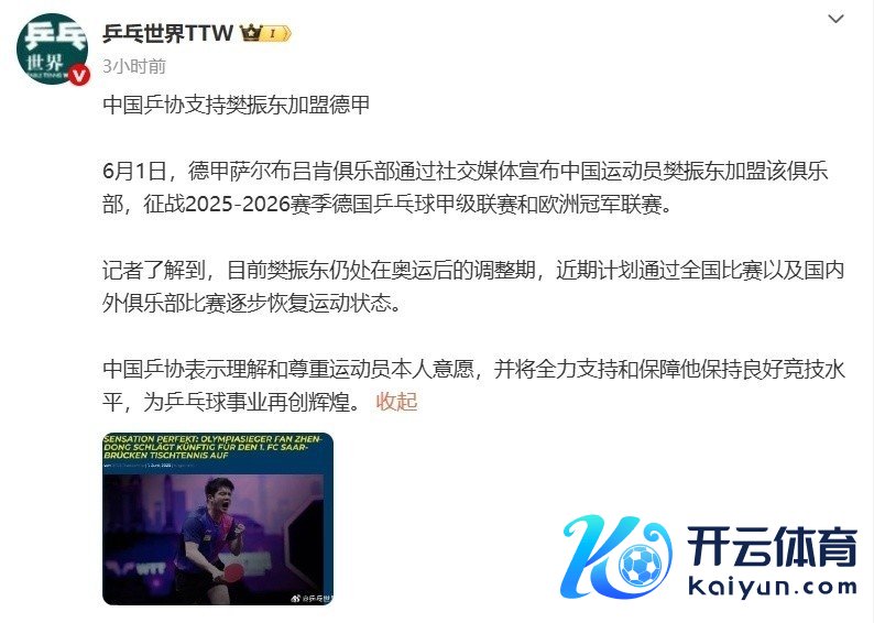 北京时刻6月1日,德甲萨尔布吕肯俱乐部在酬酢媒体上厚爱宣告中国乒乓名将樊振东的加盟,这一音信赶紧激勉寰球乒乓球迷的泛泛暖和,靠近这一重磅新闻,中国乒协立时发布公告体育集锦,一纸声明背后遮挡玄机,字里行间传递出关节信号