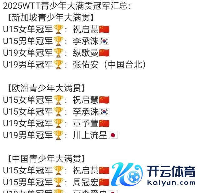这小姐叫祝启慧,2012年景就的,本年才13岁。便是这个小丫头,依然偷偷地在国外赛场上掀翻了不小的波澜。此次中国站的U15女单冠军是她的,决赛4-1拿下了队友刘子菱。这不算完,往前倒,欧洲站的U15冠军是她的,再往前,新加坡站的冠军如故她的。三站青少年大满贯,三个U15女单冠军,全被她一个东谈主包了。一个13岁的选手,寰宇名次依然冲到238位,这可不是闹着玩的,证据她依然运转在成东谈主组的比赛里抢积分了。