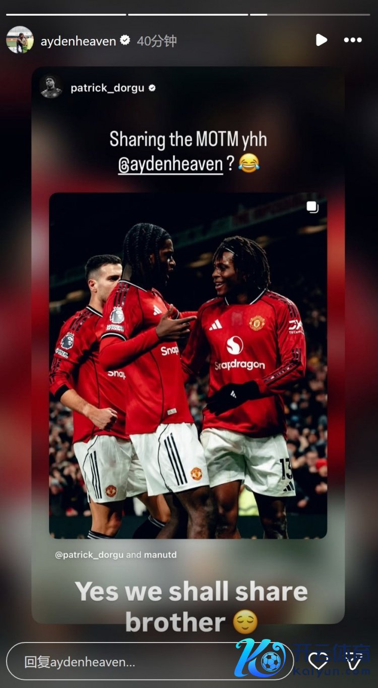 多尔古社媒晒出与海文的赛形式照,配文:“咱俩共享全场最好球员奖,对吧?”