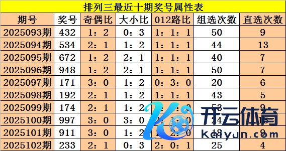 上期转头:体彩成列三第2025102期奖号:233,奇偶比2:1,大小比0:3,012比2:0:1。