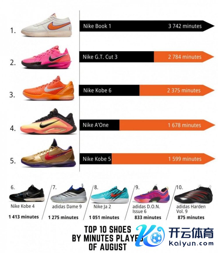 第二的是Nike的团队鞋款GT Cut 3,第三的是科比的Kobe 6,随后第四是阿贾-威尔逊的个东谈主签名鞋AOne,第五也曾科比的Kobe 5。