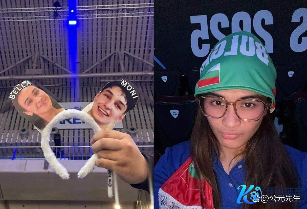 身上衣服保加利亚的T恤,脖子上围着保加利亚的领巾,这王人算是通例操作。最顶的是她头上戴的发带,上头印的果然是她和尼科洛夫的合照。这操作,径直把“磕糖”的氛围拉到了偏激,就差把“我可爱你”四个字写脸上了。