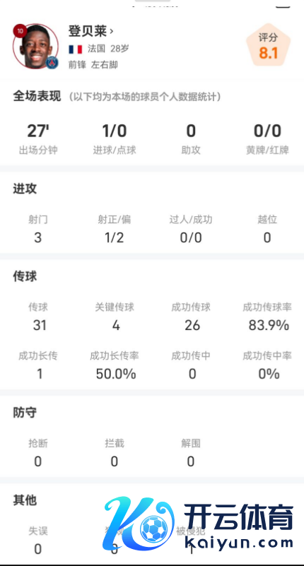 登贝莱在场上有着31次传球,26次得手,其中包括4次重要传球,传球得手率为83.9%。登贝莱还有着1次得手长传,得手率为50%。