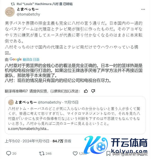 八村塁还转发了一个球迷的褒贬:“并不是霍瓦斯让日本男篮变得更强,而是适值出现了一批优秀的球员!”你以为这就摒弃了?11月24日,湖东谈主和掘金的赛后,八村塁接受采访时说:“要是篮协连续复古霍瓦斯,我方将退出日本男篮!”