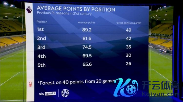 诺丁汉丛林近期的强势发达让媒体和球迷对他们的最终收货抱有更高期待,天外体育统计了本世纪以来英超前5名的平均积分,冠军球队89.2分,亚军81.6分,季军74.5分。