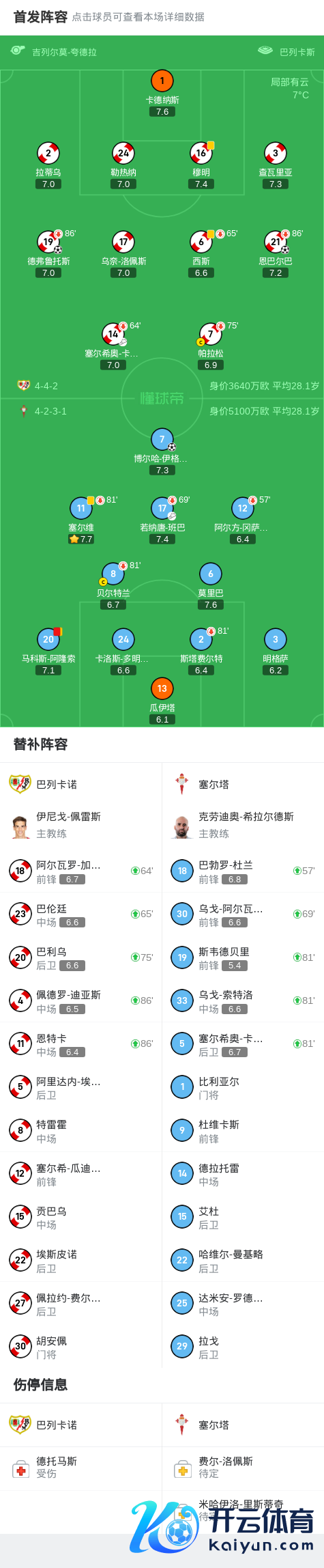 北京时间1月11日西班牙足球甲级联赛 联赛 第19轮,巴列卡诺主场对阵塞尔塔。巴列卡诺恩巴尔巴破门,德弗鲁托斯破门。塞尔塔博尔哈-伊格莱西亚斯破门。最终比分巴列卡诺 2-1 塞尔塔。