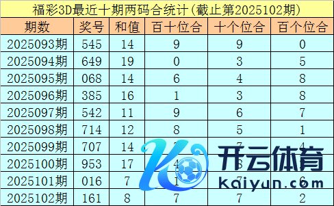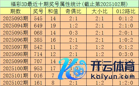 开奖精致:第2025102期福彩3D奖号为161。奖号方式为组三,大小比为1:2,和值为8体育赛事直播,奇偶比为2:1,012路比为1:2:0,跨度为5。