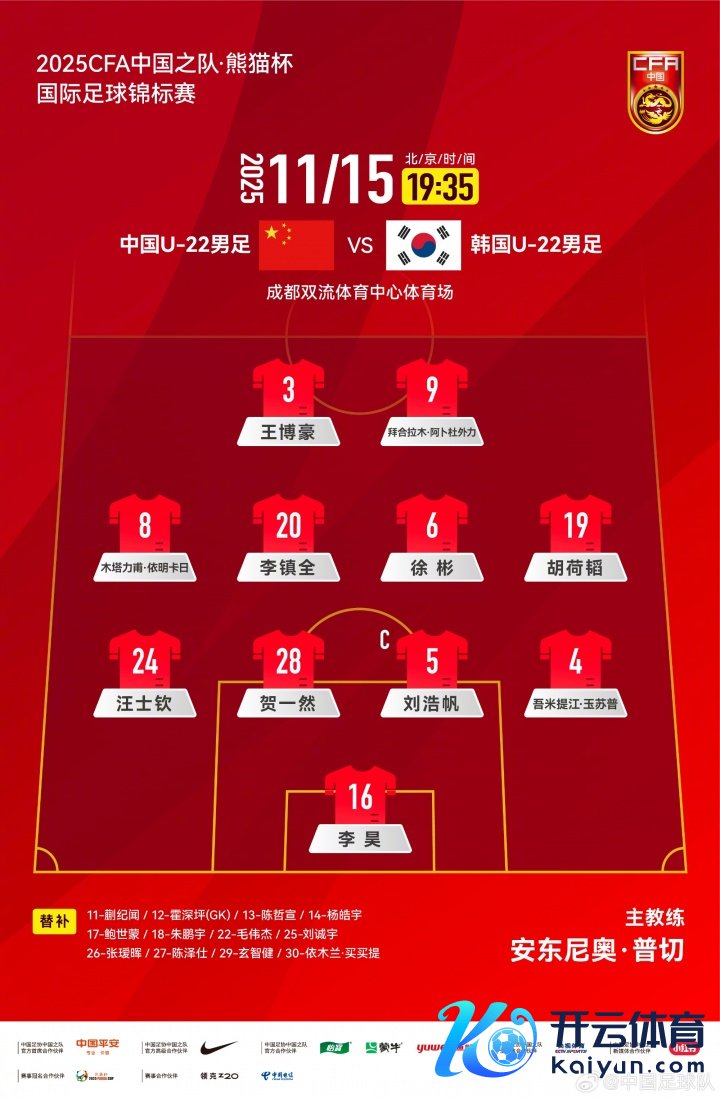 11月15日讯 熊猫杯中国U22vs韩国U22首发威望公布,中国足球队官方账号给出本场首发阵型图,U22国足遴选442阵型。