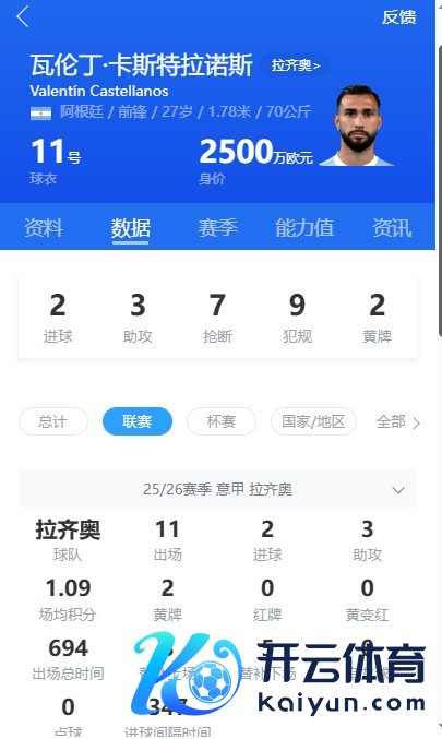 卡斯特拉诺本赛季为拉都奥介怀甲出战了11场,有2球3助,现时转会商场为他的估值为2500万欧元。
