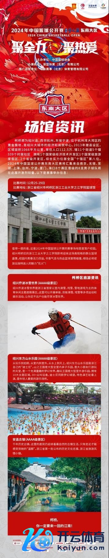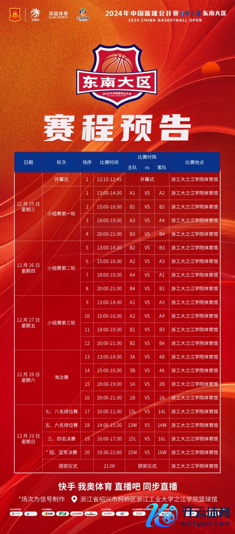 12月25-29日,2024年中国篮球公开赛洋河梦之蓝东南大区赛将在浙江省绍兴市柯桥区浙江工业大学之江学院体育馆举办,来自东南赛区各省市的8支男篮戎行将在绍兴柯桥浓烈争夺通往宇宙总决赛的入场券。八支劲旅,谁与争锋,咱们拭目而待!